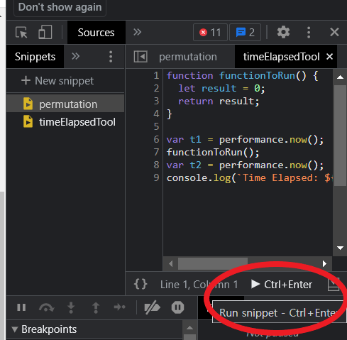 괜히 유용한 것이 아니다. 크롬에 저장된 JS 코드니까 당연히 바로 실행(Run Snippet)해볼 수도 있다.