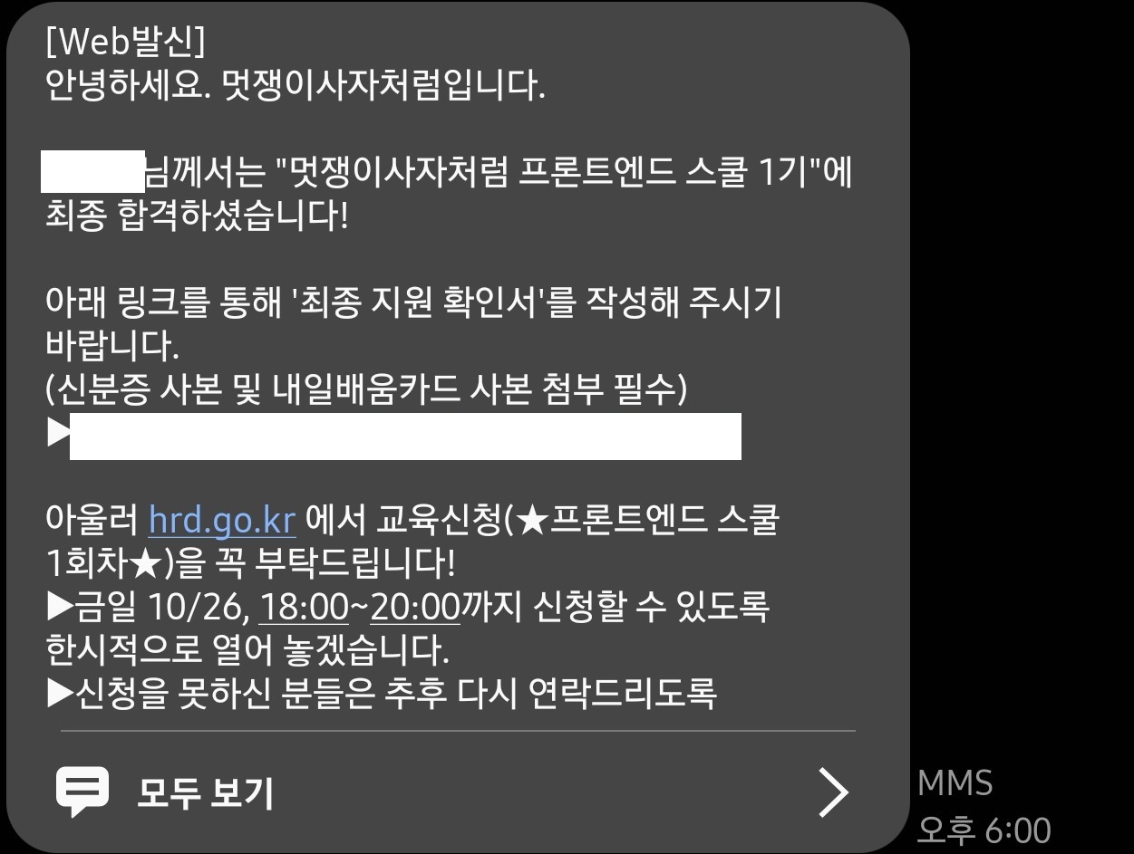 대기 타던 중 6시가 되자마자 너무 감사하게도 1기 최종 합격 문자를 받게됐다!